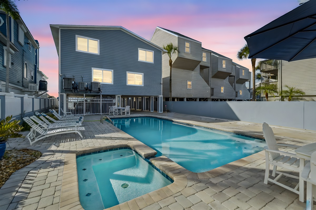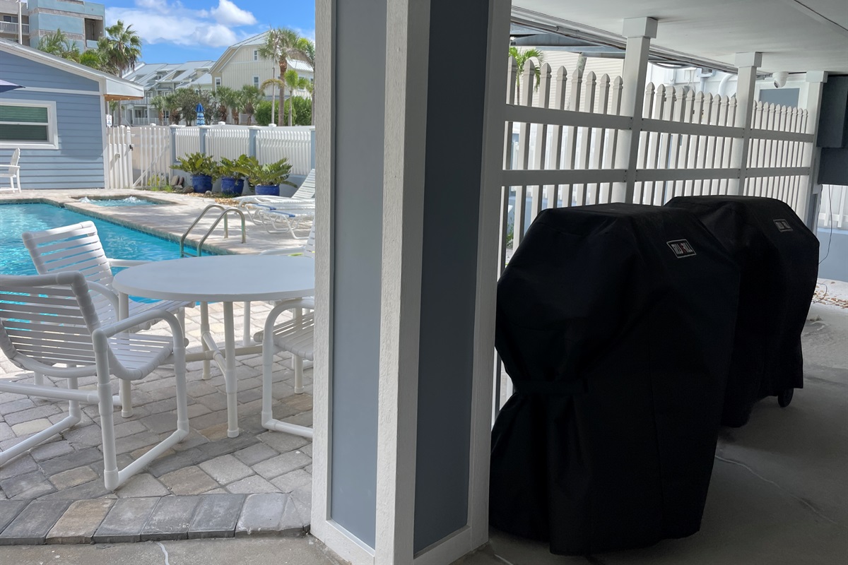 Step through the sliding glass doors to discover your own slice of paradise. The soothing sounds of the waves and the fresh scent of saltwater invite you to dip your toes in the Gulf. Enjoy the convenience of being able to quickly return to the condo for snacks, drinks, or a restroom break without the hassle of lugging gear from a distant parking spot. The onsite pool is perfect for a refreshing swim, and the surrounding loungers are ideal for sunbathing. Savor lunch on the beach or by the pool, and for a memorable sunset dinner, fire up one of the two onsite grills. This outdoor space is crafted for relaxation and enjoyment, making it the perfect spot to unwind after a day at the beach.